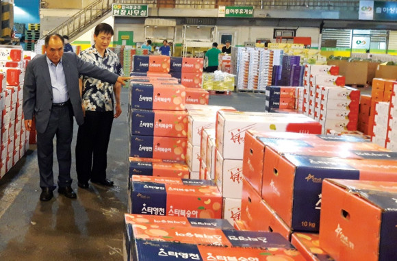 | | | ⓒ 영천시민뉴스 | | 임고농협 임직원은 지난 7월 19일, 농산물가격 하락으로 인한 조합원의 힘든 마음을 고려하고 상인들을 격려하는 차원에서 서울가락농산물 도매시장을 방문했다. 사진은 최용수 조합장(좌)이 ‘스타영천 스타복숭아’ 상자를 보며 영천과일을 홍보하고 있다.