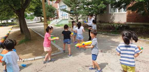 포은초등학교병설유치원(원장 이찬우)은 지난 7월 23일 방과후놀이중심유치원 운영으로 놀이터에서 물총놀이를 진행했다.