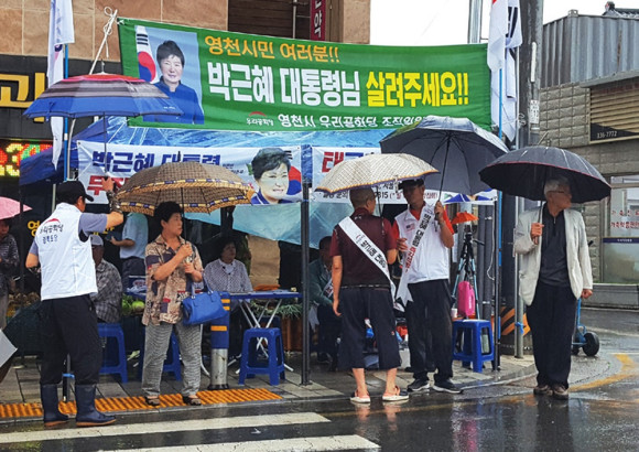 박근혜 전 대통령 무죄석방 서명운동이 지난달 27일 완산동 사무소 입구 등에서 열렸다. 서명운동은 영천시 우리공화당 조직위원회와 우리공화당 경북도당에서 주관했다. 이날 비가 내리는 가운데도 많은 시민들이 서명대를 찾아 서명하기도 했다.