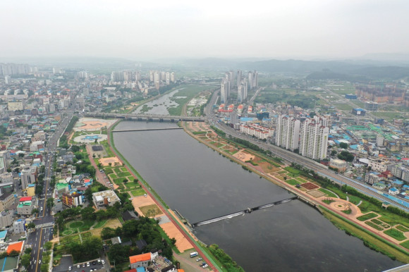 금호강을 중심으로 완산동에도 고층 아파트들이 점차 들어서고 있어 강남 강북 대칭을 이루며 도시형성이 이루어지고 있는 모습.