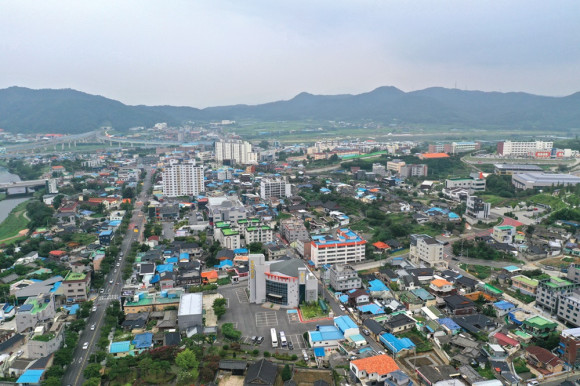 영천의 중심지 역할을 하는 중앙 동부동 일대 모습, 고층 아파트들이 가장 자리에 위치해 있어 도심이 다소 여유로워 보인다.