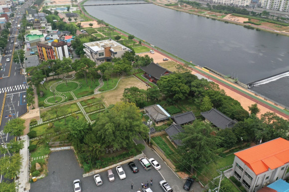 드론촬영 교육후 본사 앞 마당에서 드론으로 촬영한 영천문화원 일대 모습, 아래쪽 자동차 옆에 교육생들이 보인다.