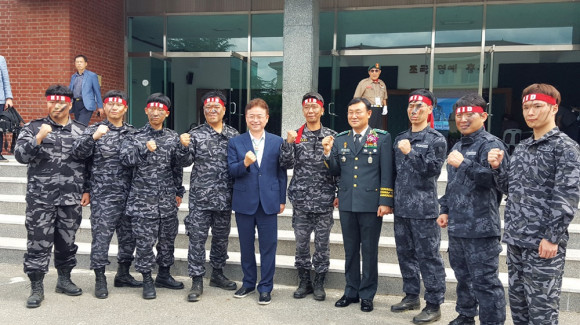 이철우 도지사는 육군제3사관학교에서 열린 2019년 국가유공자와 유공자 가족 한마음대회 참석하고는 이날 행사를 주관한 특수임무유공자회경북지부 회원들과 기념사진을 찍으며 파이팅을 외치고 있다. 이 지사 옆쪽에는 장달수 3사관학교장이다.
