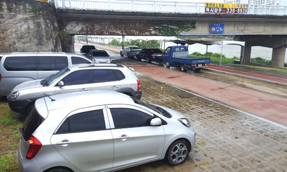 태풍 소식이 실시간으로 전해지고 있는 가운데 시민들은 평소 때와 같이 둔치에 차를 주차 해두고 있다. 지난 9월 22일 오전 11시경 둔치에는 주차 차량들이 꼼짝 않고 있어 안전 불감증을 알 수 있다. 손진열 중앙동장은 오후 직원들과 둔치를 순찰하면서 차량 이동을 차주에게 알리기도 했으나 그래도 차주들은 나 몰라라 식이었다.