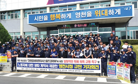 전국금속노조 경주지부 등은 지난 9월 26일 영천시청 본관 앞에서 영천 채신공단에 위치한 ‘다이셀세이프티시스템즈코리아’에 대한 일방적인 특혜의혹 규명 촉구 및 노동자에 대한 왕따 계약서 체결한 영천시청 규탄 기자회견을 열었다. 이 공장에는 올해 4월 민주노총 금속노조 다이셀지회가 설립되어 있으며 현재 노동조합은 파업투쟁에 들어가 있는 상태다.