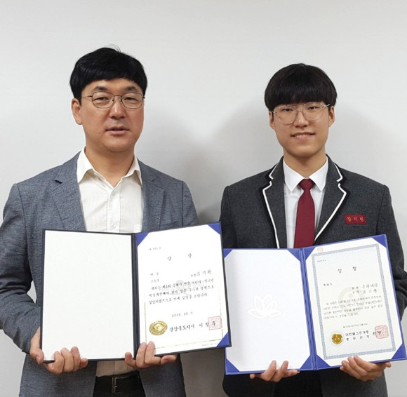 ↑↑ 조영득 지도교사(좌)와 김기원 군(우)이 수상 후 함께 기념촬영을 하고 있다.