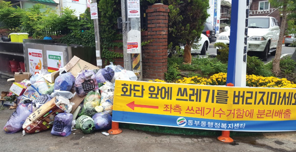 동부동 사무소 바로옆 쓰레기 분리 수거통이 있음에도 불구하고 쓰레기를 그냥 버리고 간 동부동민들의 나 몰라라 하는 의식이 1등 동부동민들의 의식이라고는 믿기지 않을 정도다. 특히 동사무소에서 작은 현수막을 붙여 두었는데도 나만 편하면 그만이다는 식으로 쓰레기를 배출하고 있다.