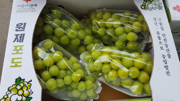 샤인머스켓 가격이 올해도 고공 행진을 하고 있다. 지난 17일 오후 금호읍 원제리 원제포도작목반 출하 현장을 찾았는데, 샤인머스켓 등 포도 출하가 한창이다. 가격은 샤인머스켓 2㎏ 기준 2만 원 전후 가격이 유지되고 있다고 한다. 한 농민은 보통 3만6000원을 받기도 했다고 한다.