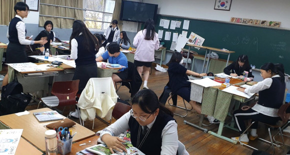 ↑↑ 영천 성남여고 학생들이 조를 나누어 문제를 해결하고 있다.
