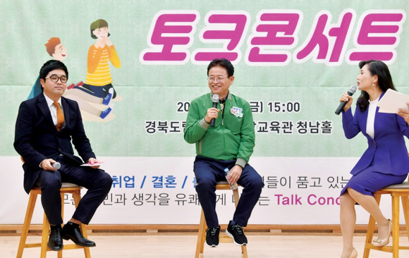 | | | ⓒ 영천시민뉴스 | | 이철우 도지사는 지난 11월 8일 경북도립대학교 청남교육관에서 지역 내 청년·대학생 150여명이 참석한 가운데 ‘청년·대학생과 함께하는 토크콘서트’에 참석하고 연애와 결혼, 취업과 출산 등에 대한 청년들의 견해를 들었다.