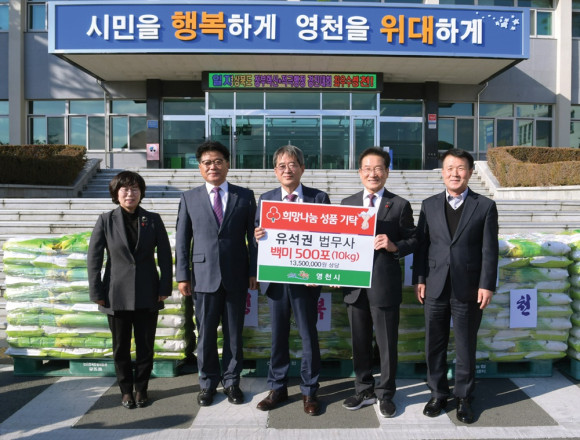 유석권 법무사는 11월 22일 지역의 어려운 이웃을 위해 준비한 사랑의 쌀 500포(10㎏)를 영천시에 기탁했다(사진). 2004년부터 시작된 지역 봉사는 장학금 기탁 및 매년 쌀 기부와 장애인, 복지시설 등 다양한 방법으로 기부되었고 올해도 500포의 쌀을 영천시로 기탁해 관내 읍면동으로 배분되어 이웃들에게 전해질 예정이다.