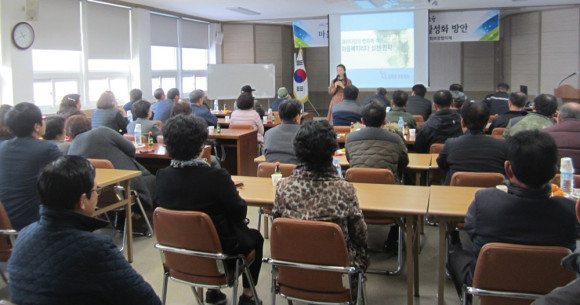 ↑↑ 청통면 지역사회보장협의체 회원들이 리더 교육을 받고 있다.