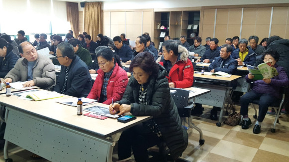 농민교육이 한창이다. 영천시 농업기술센터를 비롯해 금호 고경 북안 등에서도 농민교육이 열리고 있는데, 교육장 마다 농민들도 가득해 농촌 향학열을 불태우고 있다. 사진은 1월 8일 오후 기술센터에서 열린 친환경교육에 참석한 농민들 모습이다.