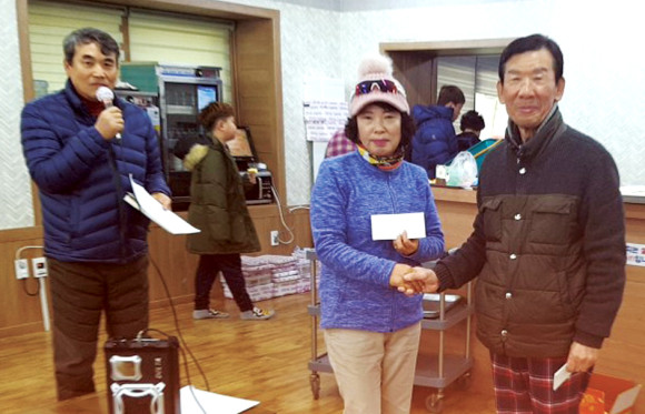 금가람 파크골프클럽(회장 황태근)은 1월 18일 조교구장에서 2020년 정기총회 및 1월 월례대회를 개최하고 남녀 개인전에 우승한 선수들에 시상식도 가졌다. 사진은 황태근 회장이 여자부 우승 김수희 선수(57타)에 시상하는 모습.