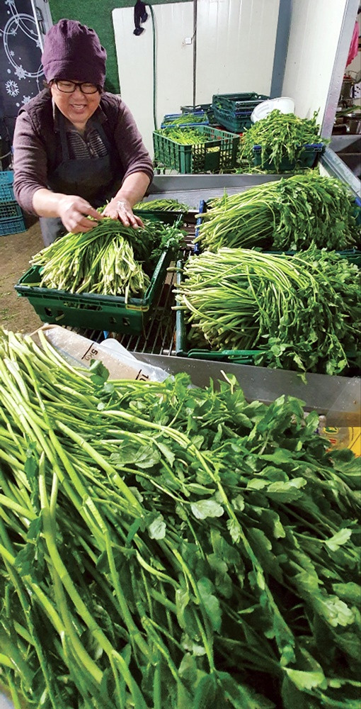 영천 6개 지역( 금호 신녕 임고 고경 북안 중앙동) 12농가에서 1월 중순부터 미나리 판매를 시작했다. 영천시에는 48농가에서 12ha를 재배하고 있으며 생산량은 151t에 이른다. 올해에는 수확시기가 평년보다 1주일가량 빨라졌다. 영천시는 미나리 판로확대를 위해 택배용 포장재를 지원하고 온라인 쇼핑몰 ‘별빛촌장터’에 입점하면 택배비를 지원한다. 사진은 임고면 영천댐 삼매미나리농장 원종일 씨가 2000㎡(600평) 비닐하우스에서 수확한 미나리를 세척하고 있다.