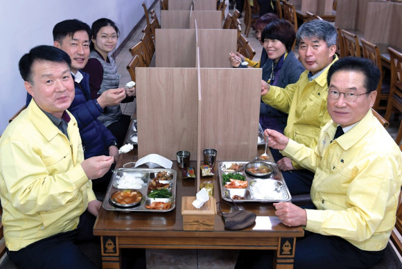 영천시는 코로나19 감염 예방을 위해 시청 구내식당 운영에 변화의 바람을 일으키고 있다. 3월 2일부터 국별·인원별 직원을 3팀으로 나눠 이용시간을 지정하고 식사하면서 직원 간 감염될 수 있는 환경을 사전 차단하기 위해 9일 테이블마다 칸막이를 설치했다.