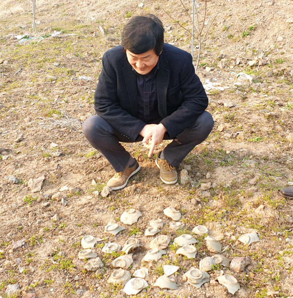 ↑↑ 이상봉 씨가 도자기 파편 무더기를 발견하고 기자에게 설명하고 있다.