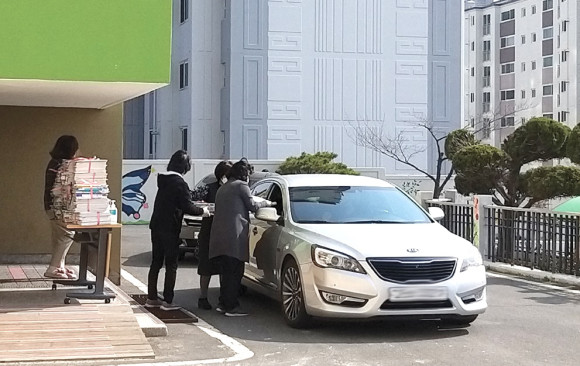 배부는 18일 수요일부터 3일간 학년별로 학교 정문을 통해 학부모들이 승용차로 들어와 차에서 내리지 않고 교과서를 수령해 직진코스로 후문을 통과하는 방식으로 차질없이 진행됐다.