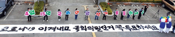 최도연 선관위 사무국장이 영천선관위 전정에서 평소 취미로 다져온 글쓰기 실력을 발휘해 대형 붓으로 ‘코로나19 이겨내고 국회의원선거 꼭 투표하세요’라는 글을 쓰고 있다.