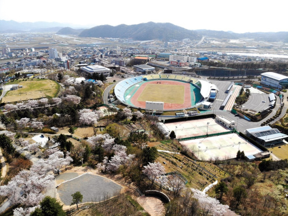 ↑↑ 메모리얼파크 바로 곁에 있는 시민운동장, 영천체육관, 구 배수지 등이 보인다.