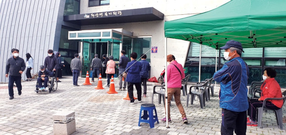 제21대 총선 사전투표가 시작된 10일 오전 10시경 화산면복지회관에 마련된 사전투표소에는 투표하러 나온 시민들이 1m이상 떨어져 줄을 서고 있다.