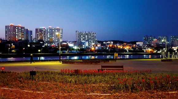 둔치 야경이 아름다워 혼자보기 아깝다. 둔치에는 수선화 튤립 등 새봄에 올라오는 꽃이 심어져 도심 야경과 어울려 운동나온 시민들의 몸과 마음을 한층 더 힐링시켜주고 있다. 좌측 아파트는 2월에 입주한 LH센트럴타운으로 도심 하늘선을 선명하고도 시원하게 해주고 있다.
