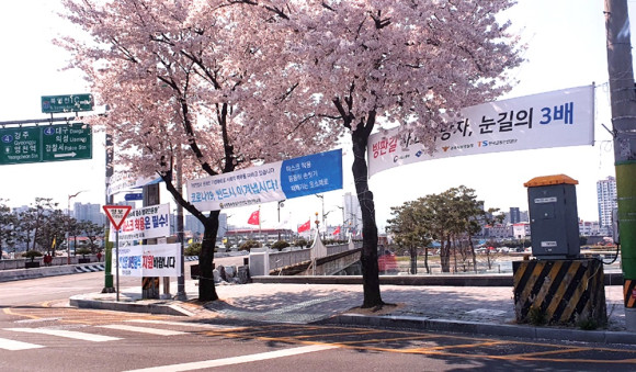4월에 접어들면서 기온이 20도로 오르내리고 있다. 벚꽃이 활짝 핀 시청오거리에 ‘빙판길 사고사망자, 눈길의 3배’라는 현수막이 걸려있어 시민들이 황당해 하고 있다.
