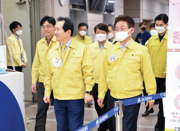 정세균 국무총리(좌측 세번째)는 4월 11일 대구경북 상황점검회의를 갖고 지역의 코로나19 대응 상황을 점검했다. 대구시청에서 개최된 이날 회의는 정 총리와 이철우 경상북도지사, 권영진 대구시장 등이 참석해 향후 대응계획을 논의했다.