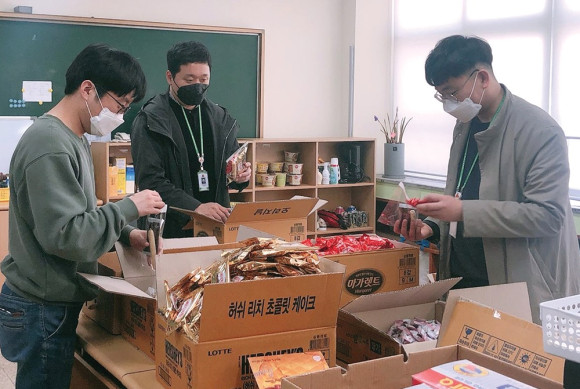 ↑↑ 포은초등에서 학생들에게 전달할 어린이날 선물을 준비하고 있다.