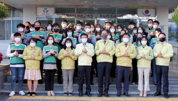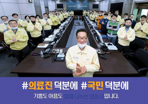 지역에서도 코로나19 위기로부터 슬기롭게 극복해 나갈 수 있도록 노력하는 의료진과 자원봉사자 등 모든 분들에게 존경과 감사를 표현하는 ‘덕분에 챌린지’에 동참하고 있다. 최기문 영천시장을 비롯한 시청직원들(위)과 영천교육지원청 전 직원(아래)이 ‘덕분에 챌린지’에 동참했다.