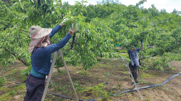 오미동에서 복합 농사를 하고 있는 복숭아밭에 복숭아 씨 솎아내기가 한창이다. 이곳도 냉해피해를 입었고 일부 복숭아가 장애를 받았으나 나머지는 왕성하게 잘 자라고 있다. 나머지 복숭아는 여름철 수확기에 상품성이 뛰어날 것으로 기대한다.
