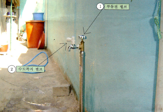 2) 최근 사용되는 수도는 부동전이라 하여 올바르게만 사용하면 동파 걱정을 하지 않아도 된다. ①번 밸브(부동전 밸브)만 잠그고, ②번 밸브(수도꽂지)는 살짝 열어두어야 한다. 그래야만 파이프 속에 남아 있는 물이 땅속으로 흘러내려서 얼지 않게 된다.