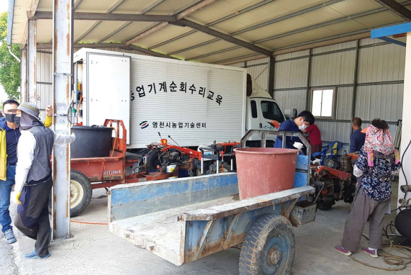 영천시는 코로나19로 지연되었던 농기계 순회수리 교육을 6월 9일부터 10월 말까지 총 40개 마을을 대상으로 주2회(화·목) 진행한다. 금호읍 약남2리 마을을 시작으로 농기계 수리점과 멀리 떨어진 마을에 직접 방문하여 소형농기계를 수리하고 농기계 안전사용과 관리요령도 안내한다.