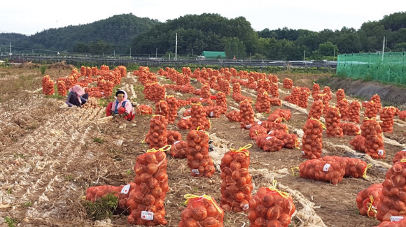 6월말 막바지 양파 수확이 화남면 삼창리에서 한창 진행되고 있었다. 농민들에 양파가격을 물으니 “올해도 안 좋은 편이다.”고 했는데, 6월말 보다 조금씩 가격이 오르고 있어 양파는 마늘시세 보다 약간 좋은 편이다. 6월말 양파 도매시세는 20kg 1만2500원에서 1만3000원.