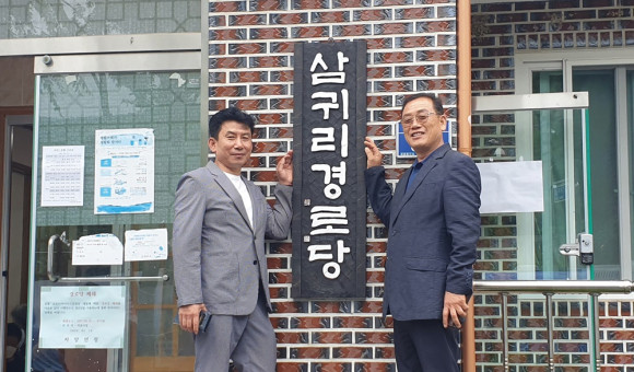 자양면 삼귀리 경로당에 작품이 걸렸다. 한국미술협회 최종윤 영천시지부장(좌)은 6월30일 자양면 삼귀리 마을경로당 환경정비사업을 마치고 마을버스 개통식을 하는 날 재능기부로 직접 서각한 경로당 현판을 전달했다.