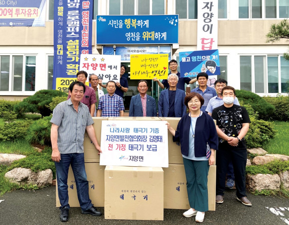 김영태 자양면발전협의회장(좌)은 8월 11일 제75주년 광복절을 맞이해 자양면 전 가구에 200만원 상당의 태극기를 기부했다.