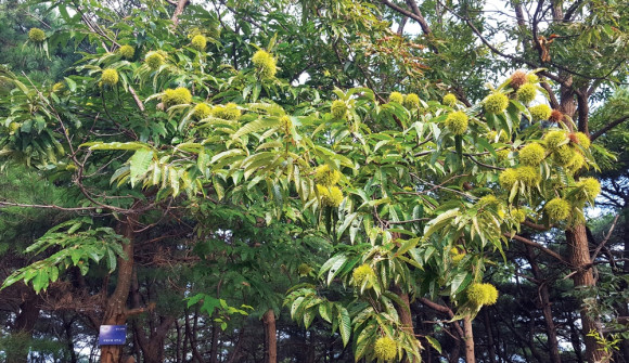 유례없는 장마, 폭염, 태풍에도 가을을 알리는 밤송이가 밤나무에서 제법 크게 익어가고 있다. 밤이 익을 무렵 사랑도 익어 가듯 온갖 역경을 이겨내고 나온 밤송이는 사악한 코로나19도 아랑곳하지 않고 묵묵히 자신의 할 일인 가을을 알리고 있다.