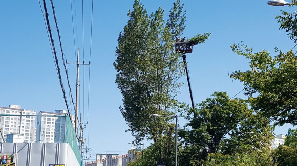 태풍으로 넘어진 대형 나무(미루나무)들에 대한 자르기(가지치기)가 진행되고 있다. 이곳은 태풍 ‘하이선’으로 대형 나무가 넘어진 곳인데, 안 넘어진 나머지 한 나무를 미리 대비하고 있는 형이다. 시내 전역에 있는 대형 나무들을 점검하고 대비하는 것이 바람직하다.