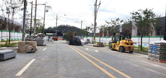 완산동 옛 공병대 부지에 조성된 도로에 이편안세상 아파트 공사현장에서 건축자재를 내놓아 운전자들이 불만을 표출하고 있다. 제보자는 “건축자재가 도로를 막고 있는데도 영천시와 경찰서에서 아무런 조치가 없다. 무법천지다”고 비난했다.