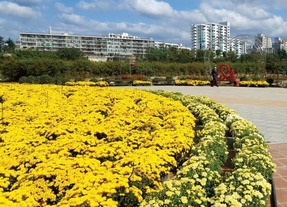 영화교 둔치 가을꽃이 장관이다. 이곳은 미소지움 1·2차 아파트 도로 건너편으로 영천시 공원관리사업소에서 직접 키운 국화 등 가을꽃을 관리하고 있다. 시민들이 꽃내음을 맡으며 산책할 수 있는 곳이다.
