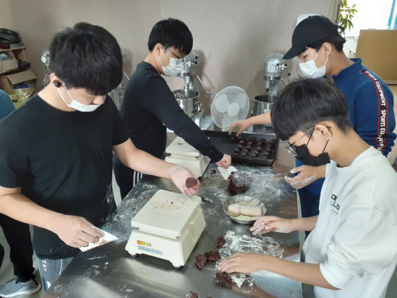 ↑↑ 영동중 재학생들이 빵을 직접 만들고 있다.