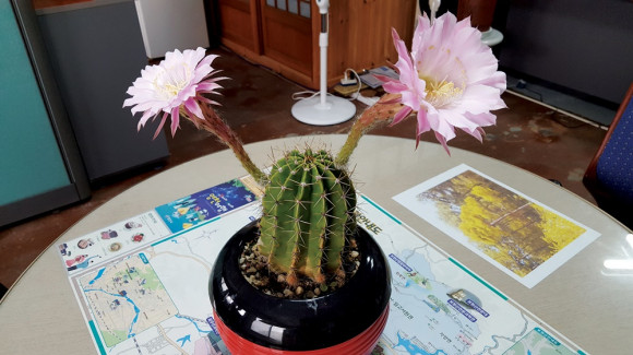선인장 꽃대 2개에서 모두 꽃이 활짝 피었다. 시내 한 사무실 실내에서 핀 선인장 꽃인데, 2개가 함께 활짝 피는 것은 드문 일이다고 한다. 2개 또는 3개가 피는 선인장도 있는데, 선인장 꽃은 하루 이틀 지나면 빨리 지는 성질을 가지고 있다.