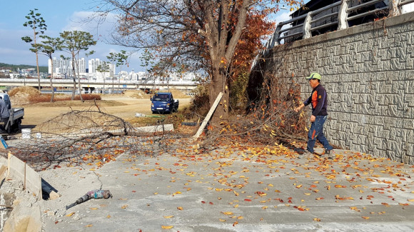 남부동쪽 둔치에 그라운드 골프장이 공사중에 있는데, 작업 인부가 둔치에서 자란 나무를 함부로 베고 있는데, ‘나무를 왜 베느냐’는 물음에 “공사차량 출입에 지장이 되므로 현장 소장이 베라고 해서 벤다”고 했다. 비전문가가 베는 행위는 주의가 필요하다.