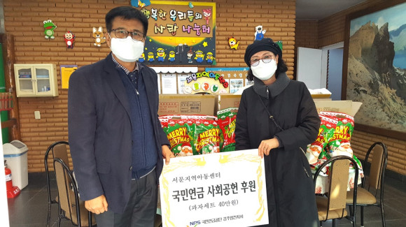 국민연금공단 경주영천지사(지사장 김도형)는 12월 22일 오후 서부동에 위치한 서문지역아통센터(센터장 김말선)를 방문하고 아동과 교사들에 연말 선물로 과자세트(40만 원 상당)를 전달하고 격려했다. 이곳엔 35명 학생들과 3명의 교사들이 있다.
