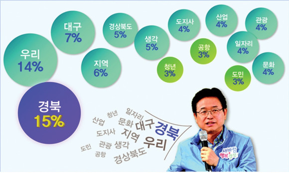 이철우 지사는 2년간 ‘경북’(1973회) ‘우리’(1853회) 라는 단어를 가장 많이 사용한 것으로 나타났다. 다음으로 ‘대구’ ‘지역’ ‘경상북도’라는 단어를 많이 사용했다. 경상북도 대변인실에서 연설문에 나타난 빅테이타를 분석(민선 상반기 2년 동안)한 결과다.