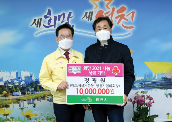 | | | ⓒ 영천시민뉴스 | | 정광원 바르게살기운동 영천시협의회장은 12월 21일 시청을 방문해 ‘희망2021 나눔캠페인’에 1000만원을 기부하며 나눔문화 실천에 앞장서고 있다. 꾸준한 기부를 실천해 온 정광원 회장은 단순한 일회성 기부가 아니라 지속가능한 사회공헌 활동을 실천하며 다양한 분야에서 기업의 사회적 공헌에 앞장서고 있다.