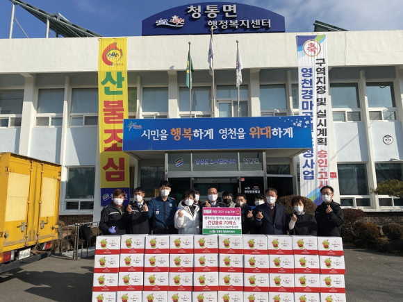 이번 나눔은 지난 10월 생필품 기부에 이어 두 번째 기부로 청통면정에 식지 않은 관심과 애정을 가진 이병희 자율방범대장과 고향 벗인 행복 나눔 밥차 조명수 씨가 지역민 및 건강취약계층이 건강을 지키며 힘든 시기를 함께 이겨 내보자라는 두 번째 선행 아이디어다.