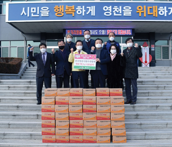 | | | ⓒ 영천시민뉴스 | | 지난 12월부터 시작된 ‘희망 2021 나눔 캠페인’에 출향인 들도 나섰다. 전국영천시향우연합회 김서현 여성회장은 12월 22일 영남 지역 향우회와 힘을 모아 이웃돕기 성품으로 떡국떡 100상자를 기탁했다.