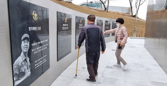 월남전참전기념탑이 지난 연말 완공, 영천전투메모리얼파크(마현산) 전적비 옆에서 위용을 드러냈다. 기념탑은 앞쪽에 태극형의 주탑과 뒤쪽에는 8개 참전부대명과 영천지역 참전 용사들(715명)의 이름을 모두 새겨두고 있다. 사진은 28일 가족과 함께 55년 전 월남전에 참전한 노병사가 가족과 함께 자신의 이름을 확인하고 있는 모습이다.