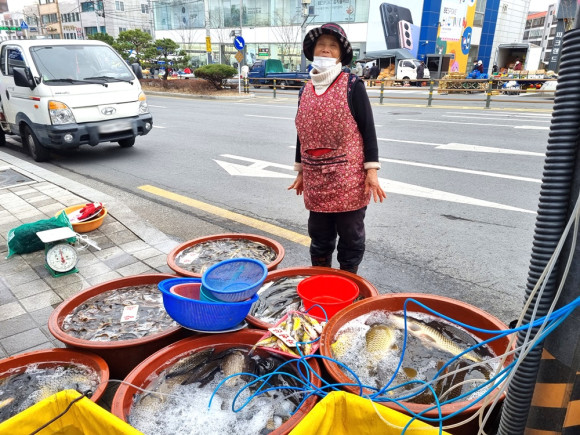 공설시장 도로변에서 민물고기를 판매(양식, 자연산)하는 상인 표정이 예전 만큼 밝지가 않다. 코로나19로 모든 업종에서 매출이 절반 이하로 떨어져 울상이지만 물고기 판매도 예외는 아니다. 그나마 다행인 것은 민물고기 판매 상인들이 거의 자취를 감추고 이제는 독점 판매를 하고 있다.